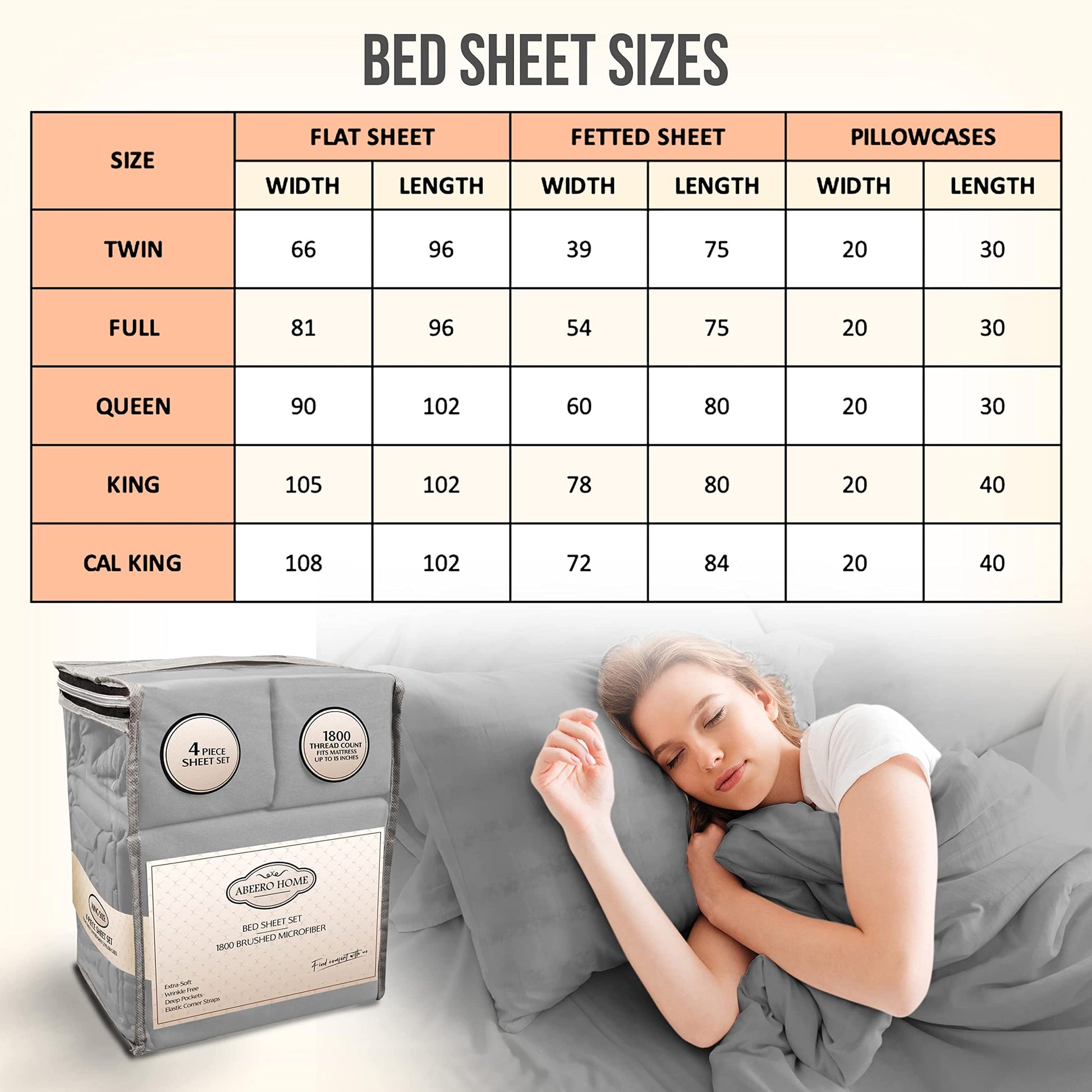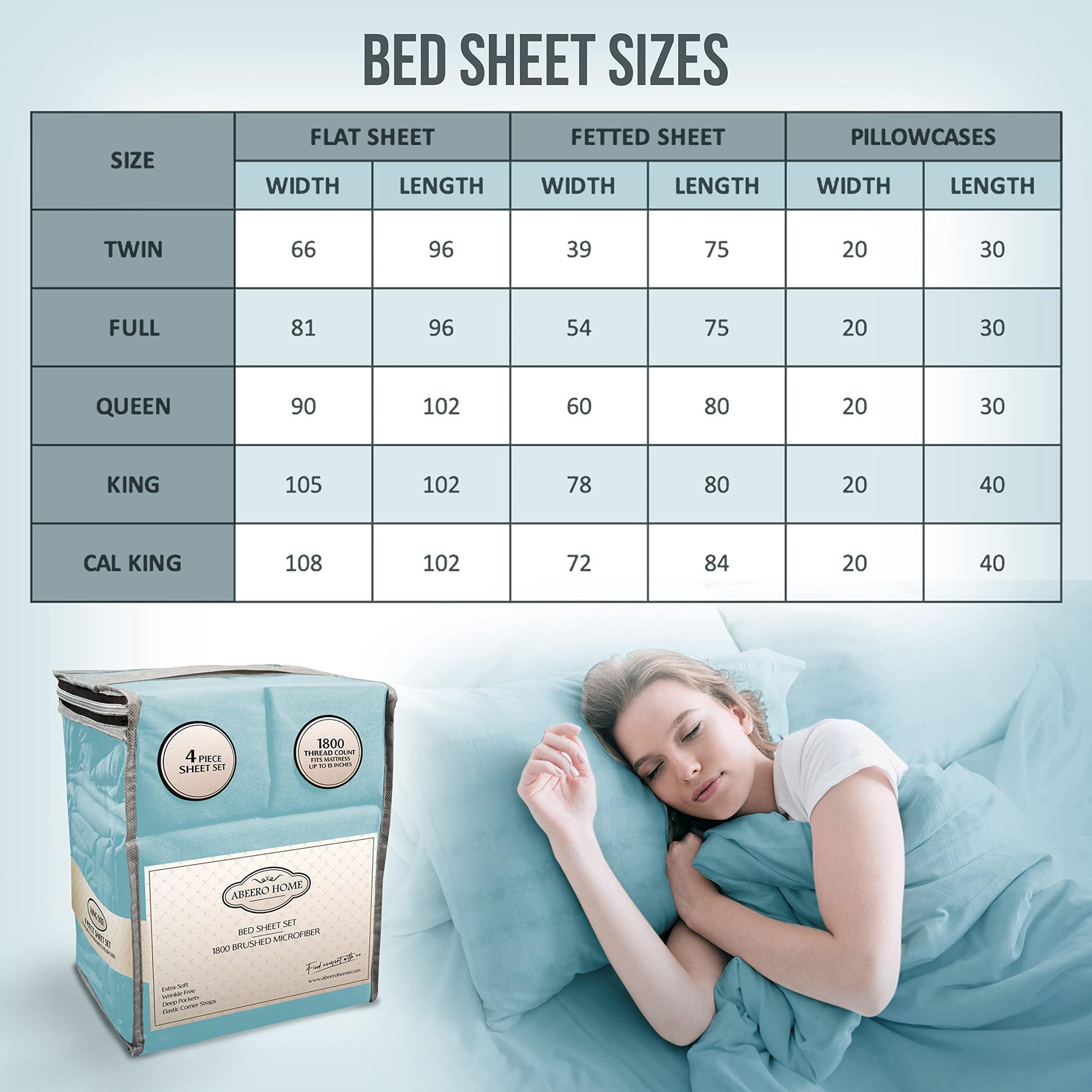 | Components | 1_flat sheet 102"x108", 1_fitted sheet 72"x84", 2_pillowcases 20"x40" | 1_flat sheet 102"x105", 1_fitted sheet 78" x 80", 2_pillowcases 20"x40" | 1_flat sheet 102"x90", 1_fitted sheet 80"x60", 2_pillowcases 20"x30" | 1_flat sheet 81”x96”", 1_fitted sheet 54" x 75", 2_pillowcases 20"x30" | 1_flat sheet 66"x96", 1_fitted sheet 39"x75", 1_pillowcase 20"x30" |
